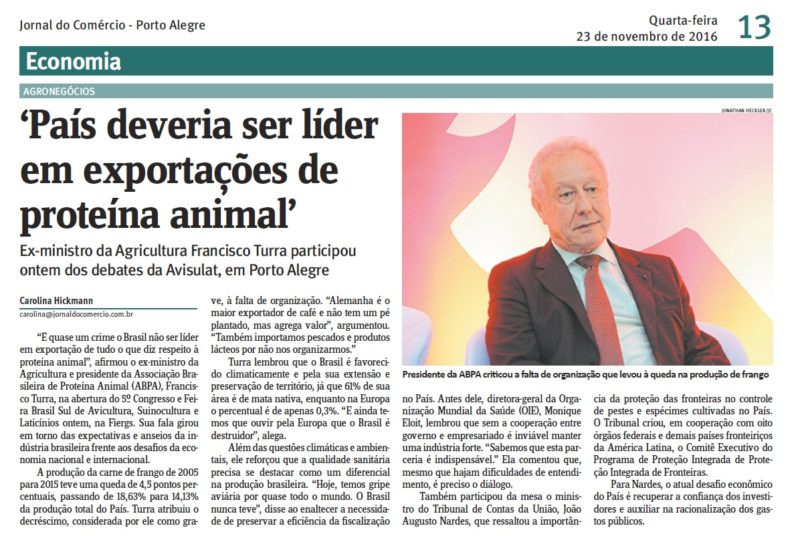 23/11/2016 – JC: ‘País deveria ser líder em exportações de proteína animal’