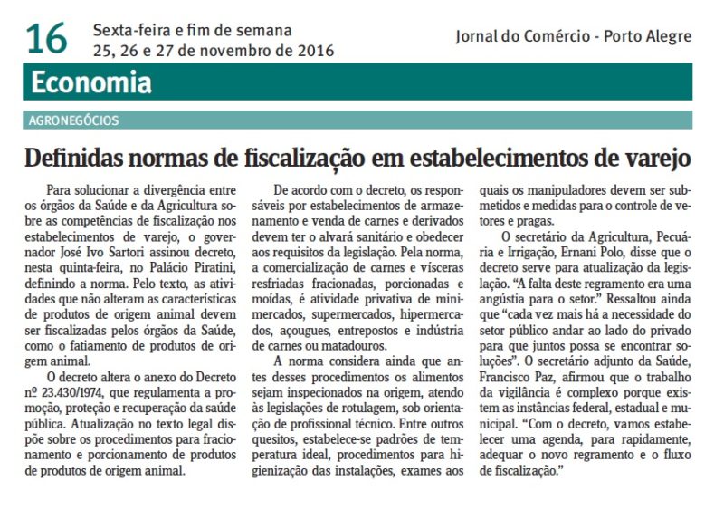 JORNAL DO COMÉRCIO | AGRONEGÓCIOS | PÁGINA 16 Para solucionar a divergência entre os órgãos da Saúde e da Agricultura sobre as competências de fiscalização nos estabelecimentos de varejo, o governador José Ivo Sartori assinou decreto, nesta quinta-feira, no Palácio Piratini, definindo a norma. Pelo texto, as atividades que não alteram as características de produtos […]