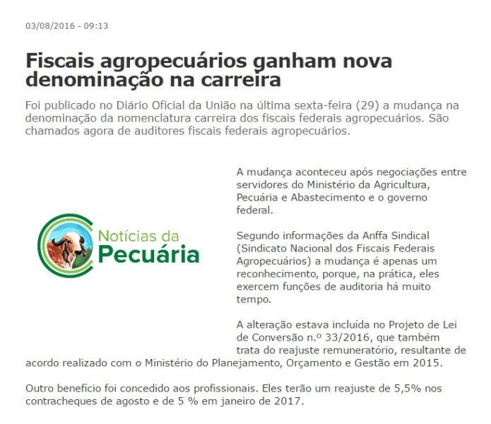 03/08/2016 – Notícias da Pecuária: Fiscais agropecuários ganham nova denominação na carreira