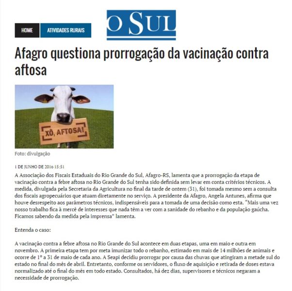 01/06/2016 – O Sul: Afagro questiona prorrogação da vacinação contra aftosa
