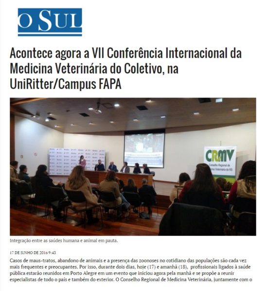 17/06/2016 – O Sul: Acontece agora a VII Conferência Internacional da Medicina Veterinária do Coletivo, na UniRitter/Campus FAPA