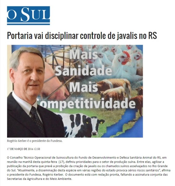 17/03/2016 – O Sul: Portaria vai disciplinar controle de javalis no RS
