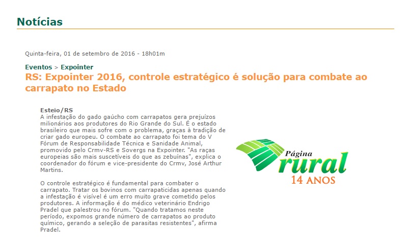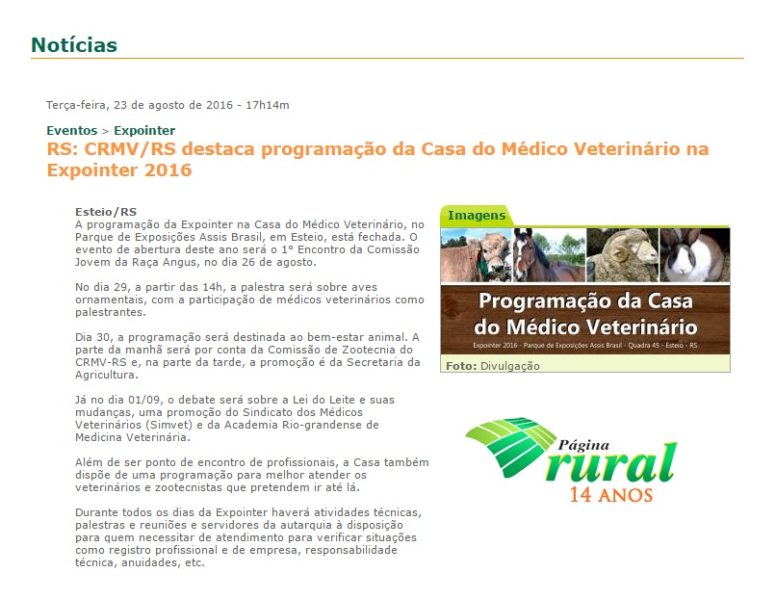23/08/2016 – Página Rural: CRMV/RS destaca programação da Casa do Médico Veterinário na Expointer 2016