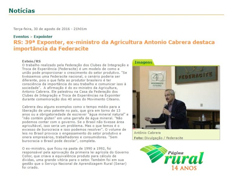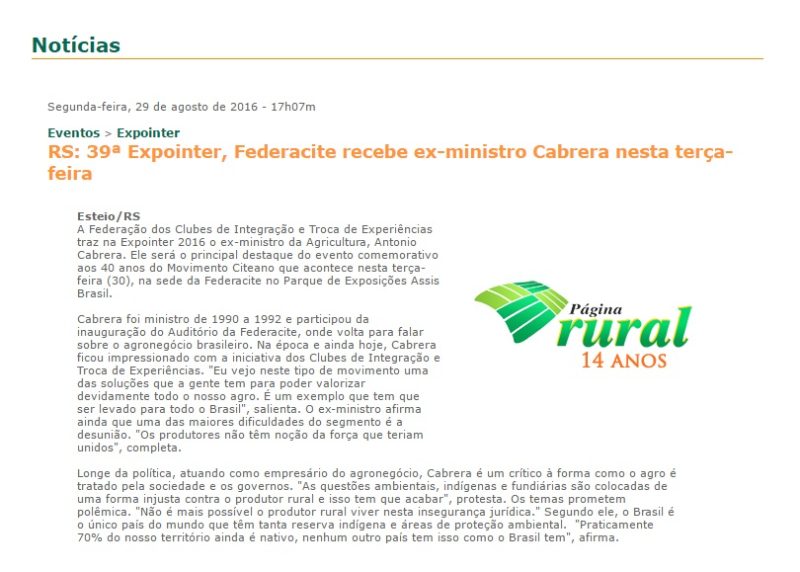 29/08/2016 – Página Rural: Federacite recebe ex-ministro Cabrera nesta terça-feira