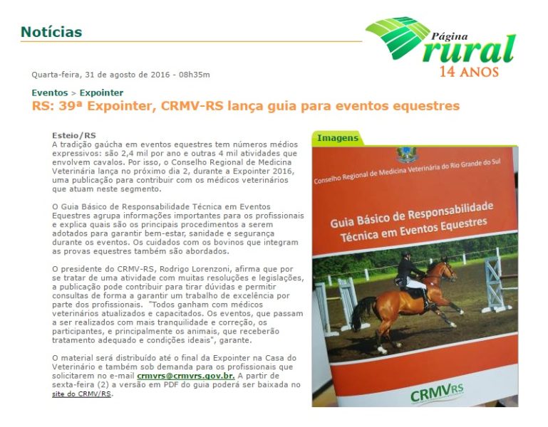31/08/2016 – Página Rural: CRMV-RS lança guia para eventos equestres