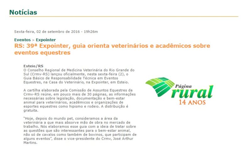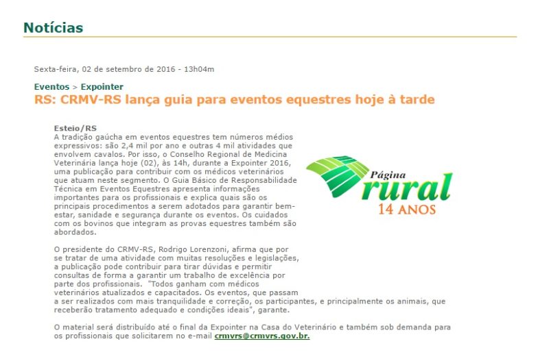 02/09/2016 – Página Rural: CRMV-RS lança guia para eventos equestres hoje à tarde