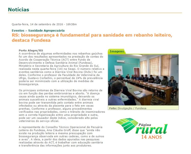 14/09/2016 – Página Rural: Biossegurança é fundamental para sanidade em rebanho leiteiro, destaca Fundesa
