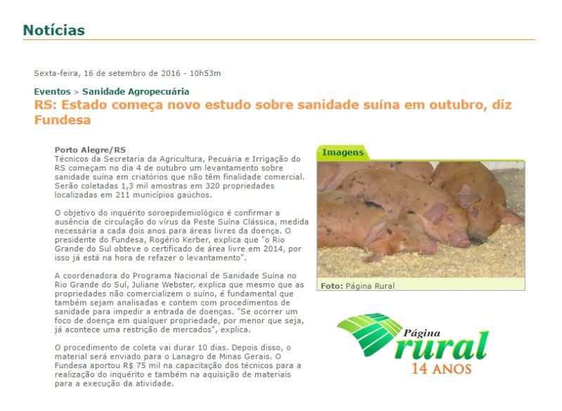 16/09/2016 – Página Rural: Estado começa novo estudo sobre sanidade suína em outubro