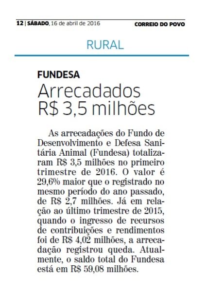 CORREIO DO POVO | RURAL | PÁGINA 12 As arrecadações do Fundo de Desenvolvimento e Defesa Sanitária Animal (Fundesa) totalizaram R$ 3,5 milhões no primeiro trimestre de 2016. O valor é 29,6% maior que o registrado no mesmo período do ano passado, de R$ 2,7 milhões. Já em relação ao último trimestre de 2015, quando o ingresso de recursos de contribuições e rendimentos foi de […]
