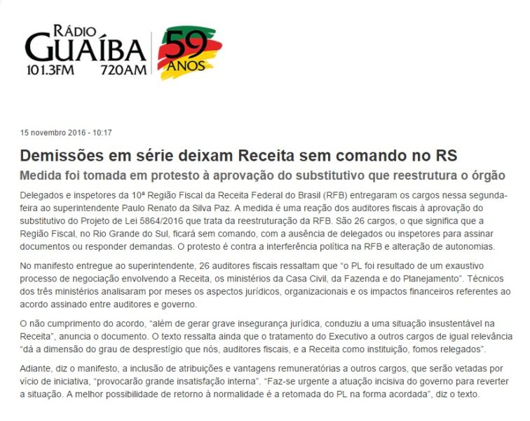 15/11/2016 – Rádio Guaíba: Demissões em série deixam Receita sem comando no RS