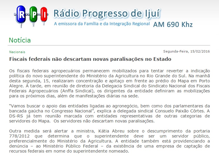 15/02/2016 – RPI: Fiscais federais não descartam novas paralisações no Estado