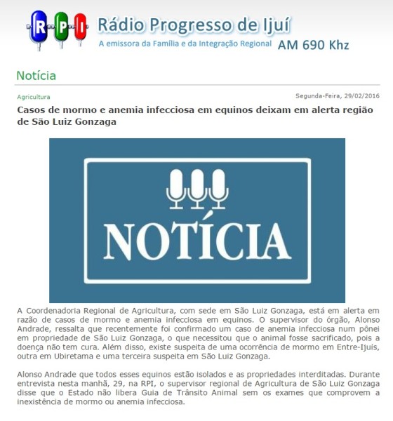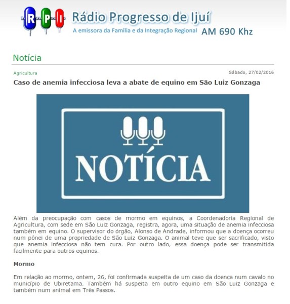 27/02/2016 – RPI: Caso de anemia infecciosa leva a abate de equino em São Luiz Gonzaga