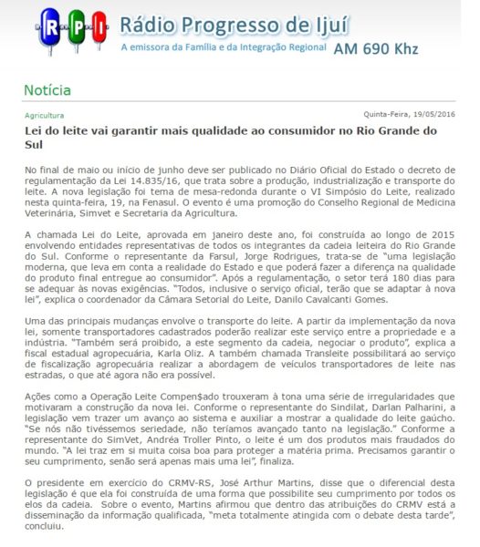19/05/2016 – RPI: Lei do leite vai garantir mais qualidade ao consumidor no Rio Grande do Sul