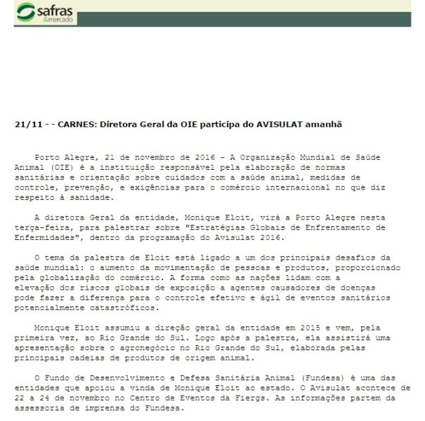 21/11/2016 – Safras & Mercado: Diretora Geral da OIE participa do AVISULAT amanhã