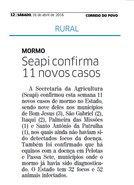 CORREIO DO POVO | RURAL | PÁGINA 12 A Secretaria da Agricultura (Seapi) confirmou esta semana 11 novos casos de mormo no Estado, sendo nove deles nos municípios de Bom Jesus (3), São Gabriel (2), Itaqui (2), Palmeira das Missões (1) e Santo Antônio da Patrulha (1), nos quais ainda não haviam sido detectados focos da doença. Também foi confirmado que há equinos com a […]