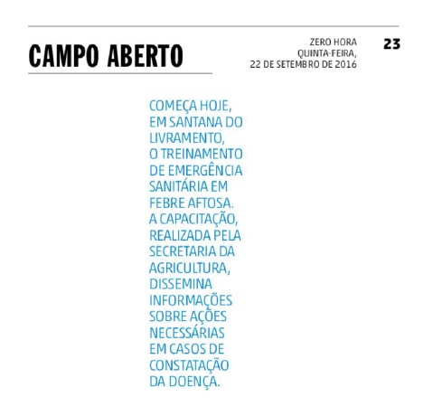 ZERO HORA | CAMPO ABERTO | PÁGINA 23 Começa hoje, em Santana do Livramento, o treinamento de emergência sanitária em febre aftosa. A capacitação, realizada pela Secretaria da Agricultura, dissemina informações sobre ações necessárias em casos de constatação da doença. Clique aqui e confira a matéria na página.