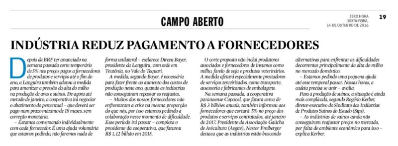 ZERO HORA | CAMPO ABERTO | PÁGINA 19 Depois da BRF ter anunciado na semana passada corte temporário de 5% nos preços pagos a fornecedores de produtos e serviços até o fim do ano, a Languiru também adotou a medida para amenizar a pressão da alta do milho na produção de aves e suínos. De […]