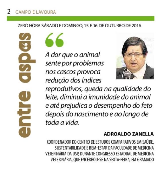 ZERO HORA | CAMPO E LAVOURA – ENTRE ASPAS | PÁGINA 2 “A dor que o animal sente por problemas nos cascos provoca redução dos índices reprodutivos, queda na qualidade do leite, diminui a imunidade do animal e até prejudica o desempenho do feto depois do nascimento e ao longo de toda a vida.” Adroaldo […]