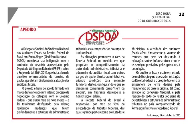 ZERO HORA | PÁGINA 12 Apedido A Delegacia Sindical do Sindicato Nacional dos Auditores Fiscais da Receita Federal do Brasil em Porto Alegre (Sindifisco Nacional – DSPOA) manifesta sua indignação com o conteúdo do relatório apresentado pelo Deputado Wellington Roberto (PR-PB), sobre o Projeto de Lei 5864/2016, que trata, além de questões remuneratórias da carreira, […]