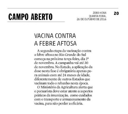 26/10/2016 – ZH: Vacina contra a febre aftosa